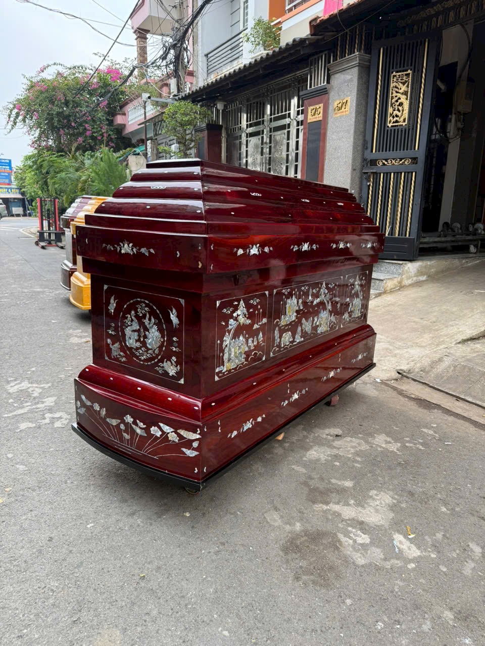 Hòm Đài Loan Gỗ Căm Xe Cẩn không chỉ đảm bảo độ bền và sự chắc chắn lâu dài, mà còn mang giá trị thẩm mỹ cao với họa tiết cẩn ốc độc đáo. Đây là lựa chọn vừa trang nghiêm vừa sang trọng, thể hiện trọn vẹn lòng hiếu kính và tình cảm tri ân đối với người đã khuất, đồng thời phù hợp với phong tục tang lễ Việt Nam.