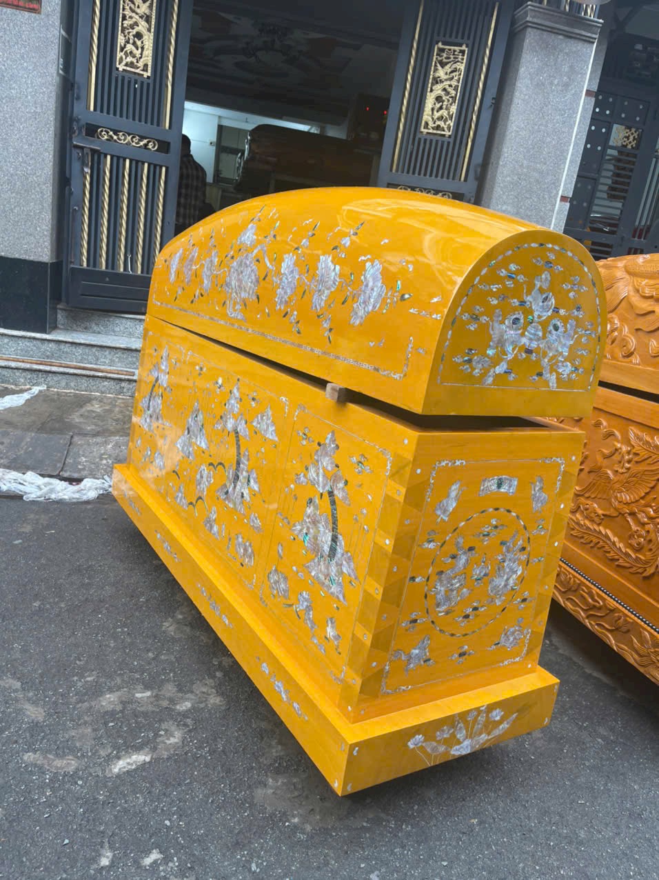 Hòm nắp tròn Cối gỗ sao cẩn của Dịch vụ mai táng Giang Thọ là sản phẩm thủ công cao cấp, nổi bật với sắc vàng rực rỡ kết hợp nghệ thuật khảm trai tinh xảo. Thiết kế nắp tròn mềm mại cùng bề mặt sơn vàng bóng mịn tạo nên vẻ đẹp trang nghiêm, sang trọng và đầy thanh thoát, mang đến sự tôn kính trọn vẹn trong nghi lễ tiễn biệt.